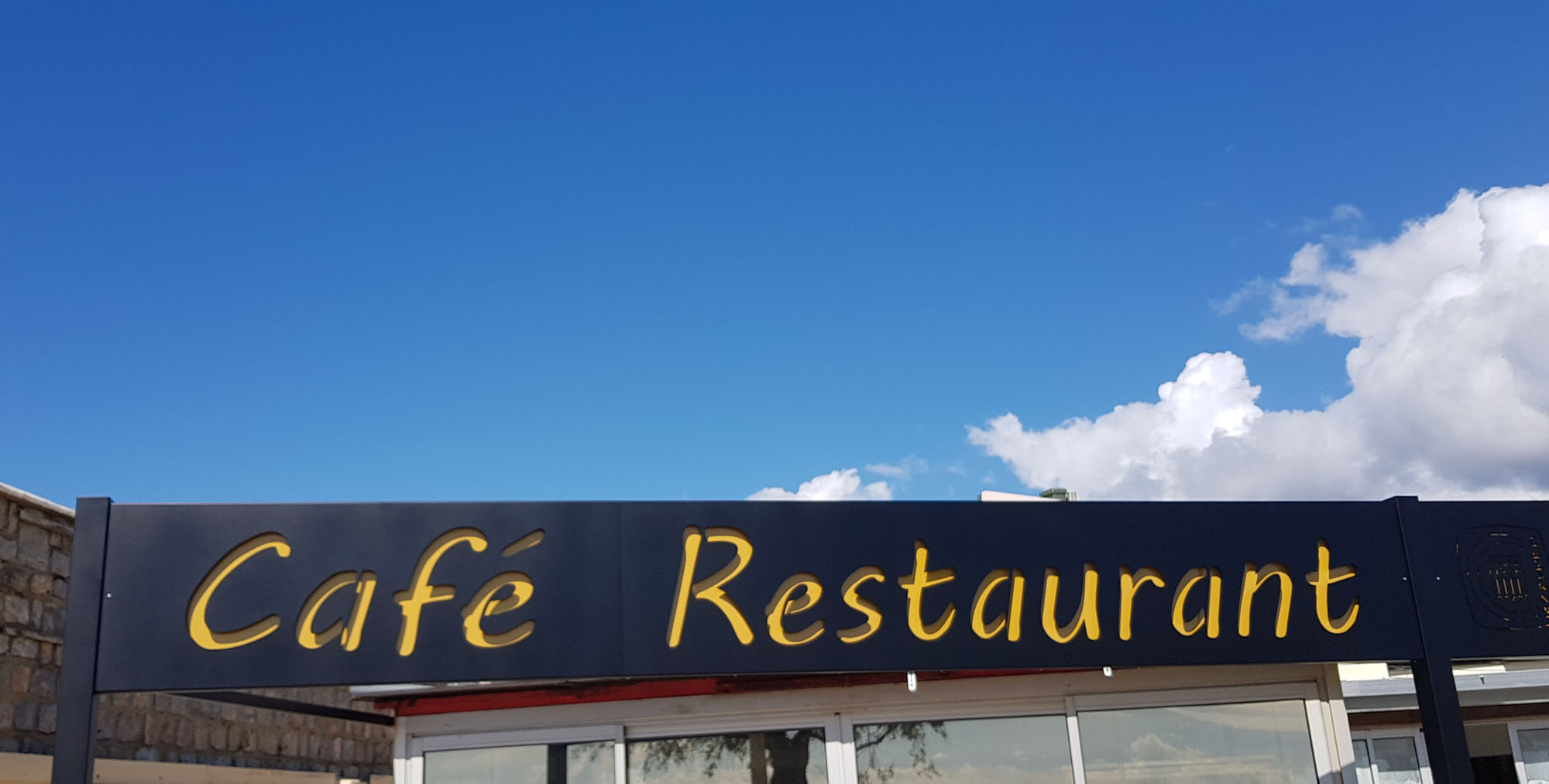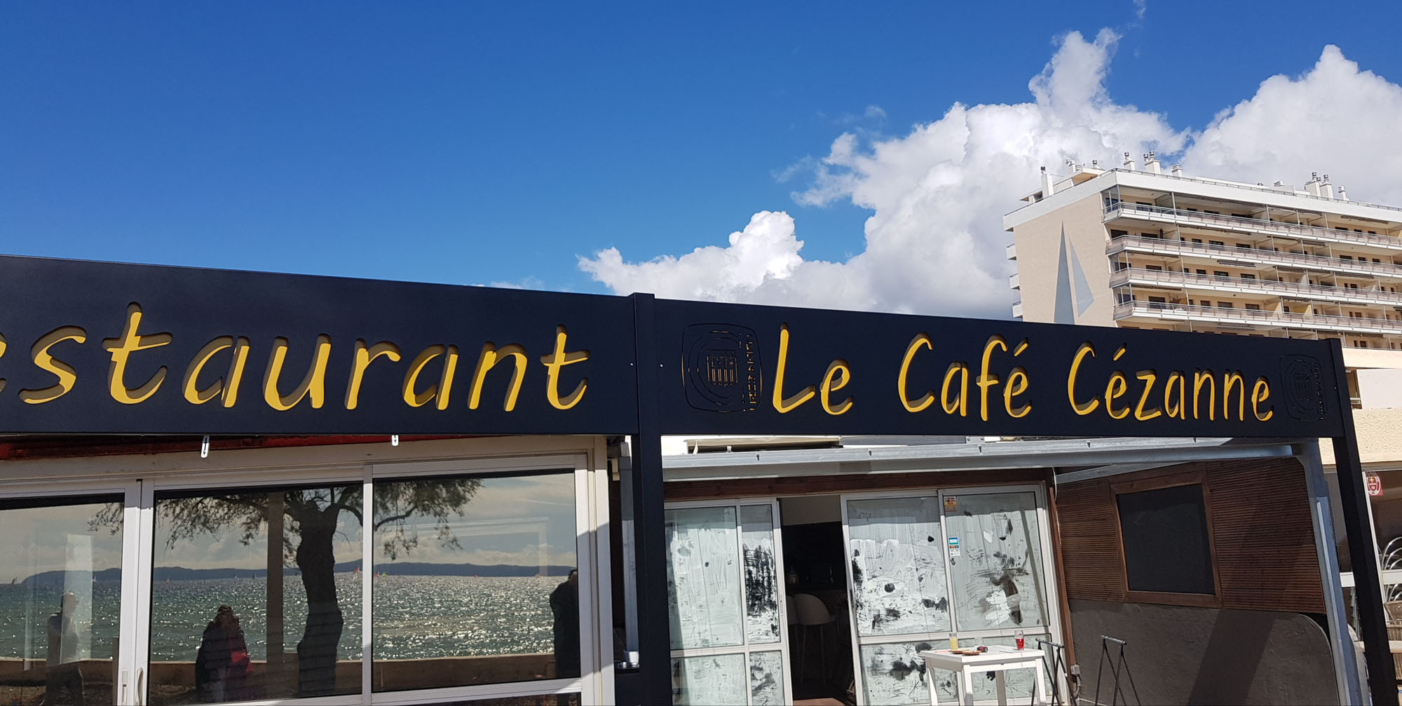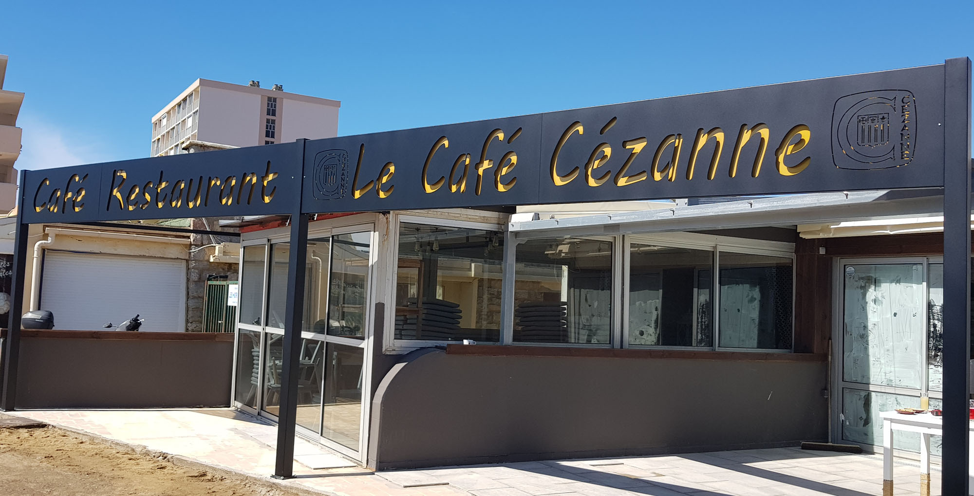 Enseigne sur chassis métal 100 x 100 , structure en fer et découpe laser en tole alu 3mm , peinture époxy et ruban led