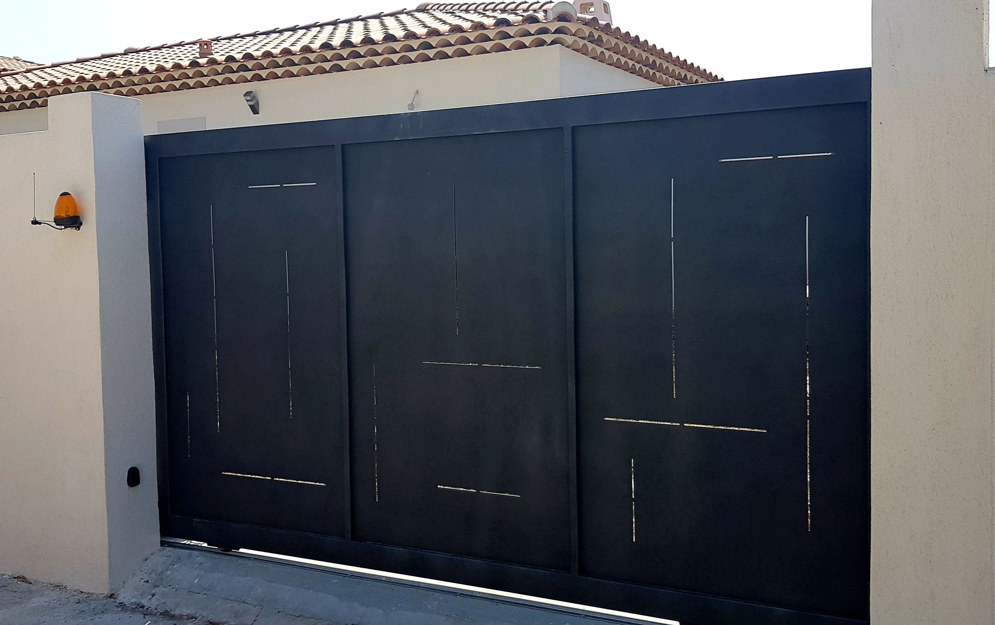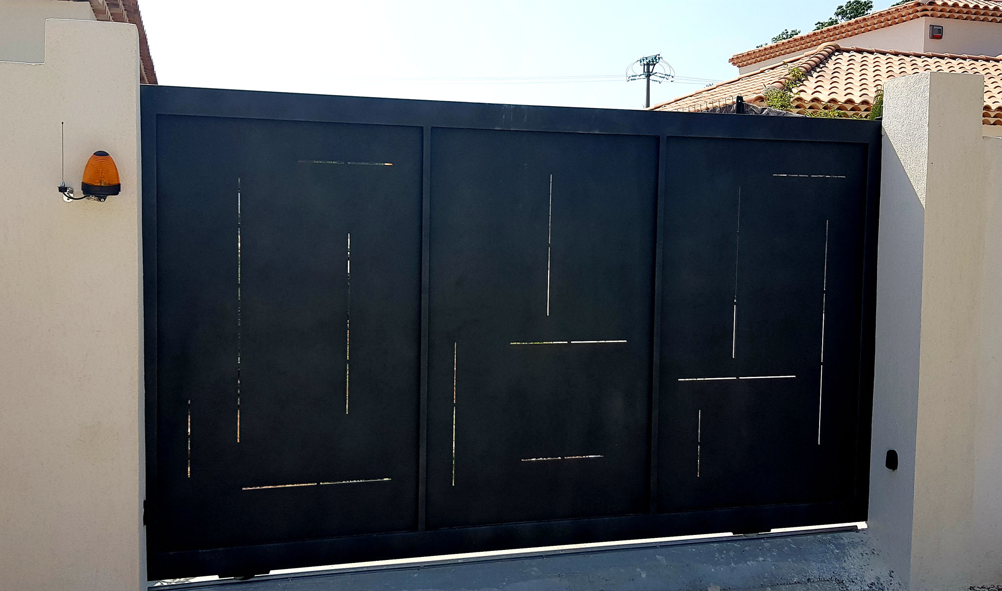Portail coulissant avec ses toles découpées au laser et peinture époxy