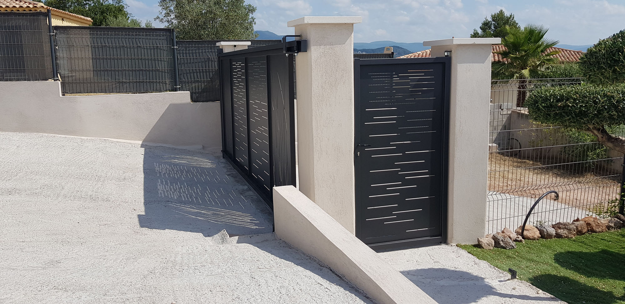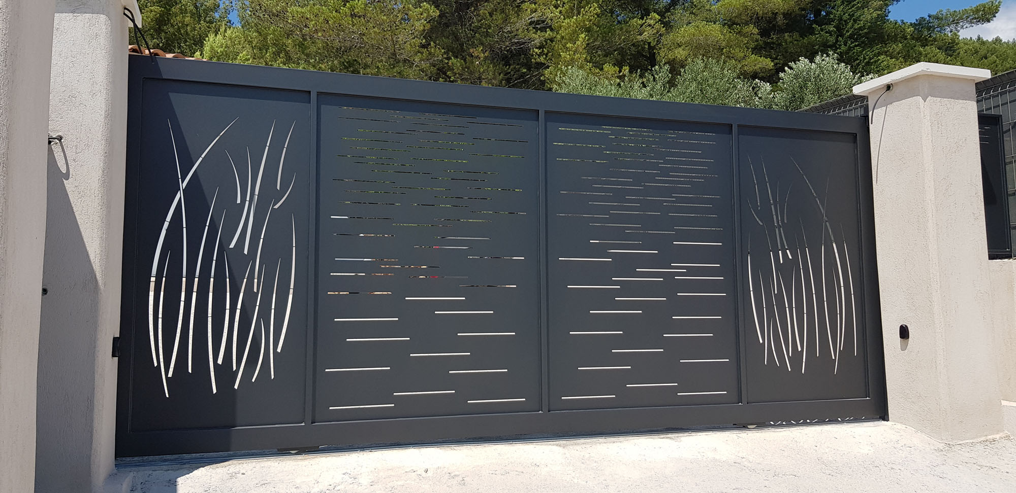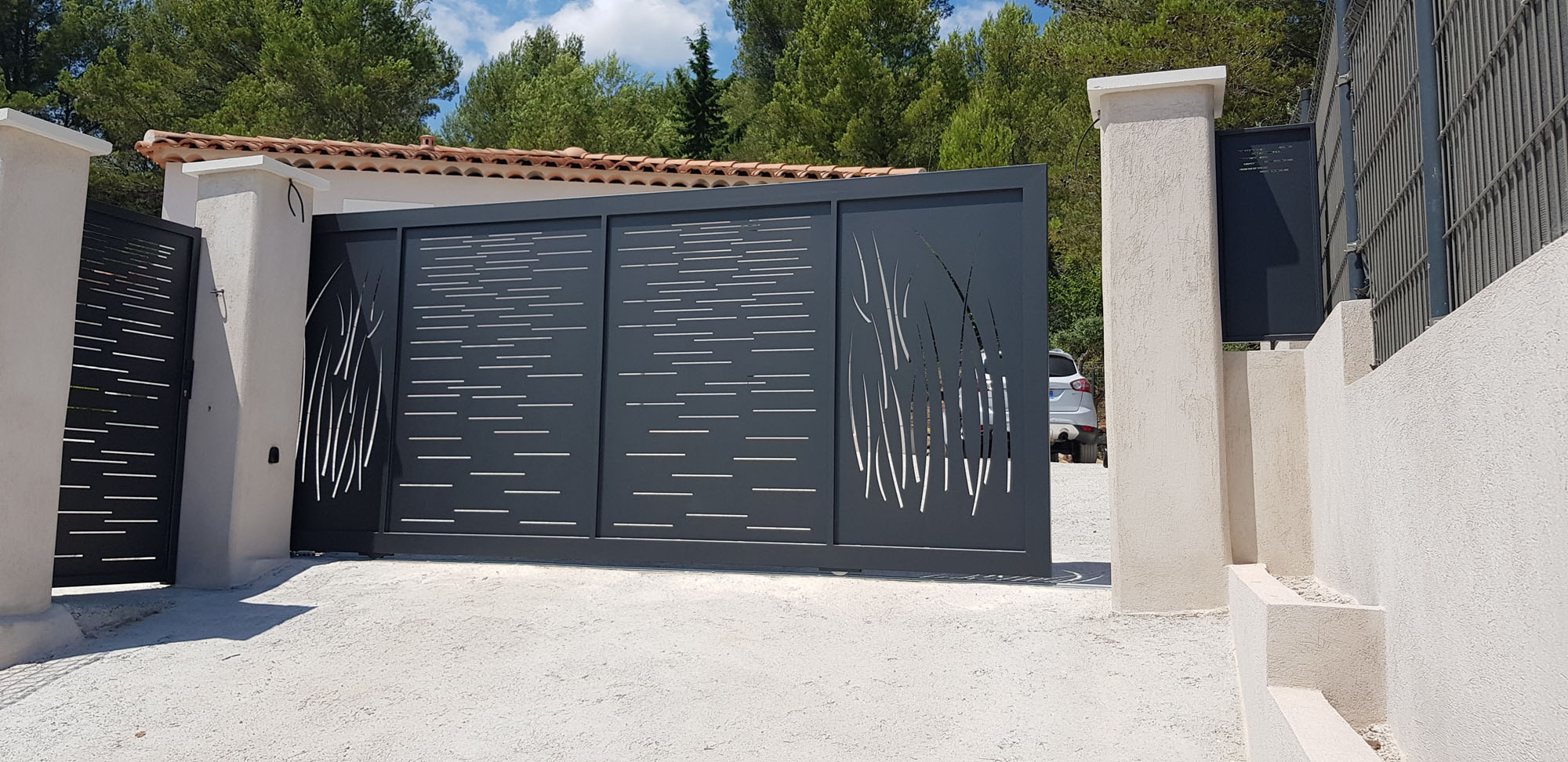Portail coulissant avec le portillon assortis , découpe laser des toles de 3 mm , peinture époxy , motorisation