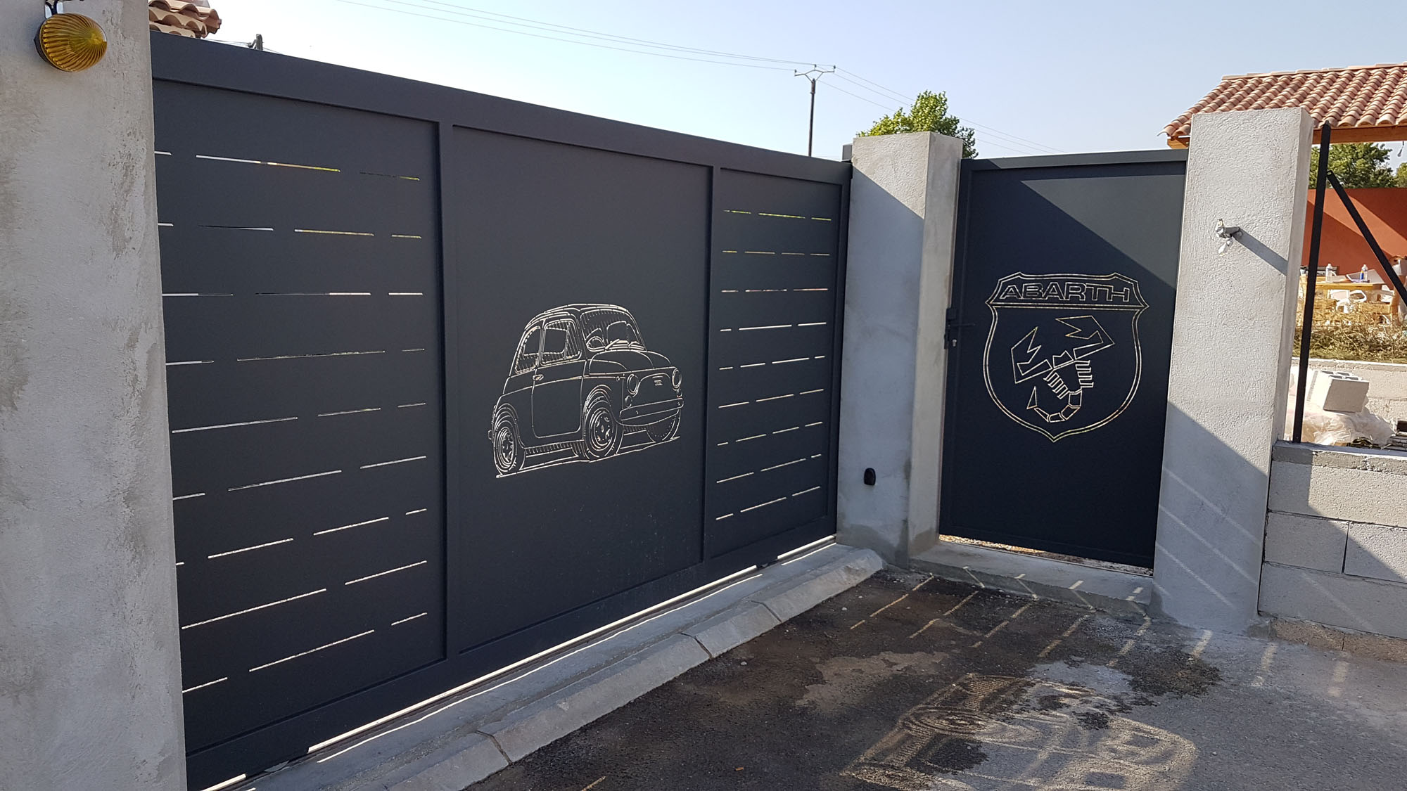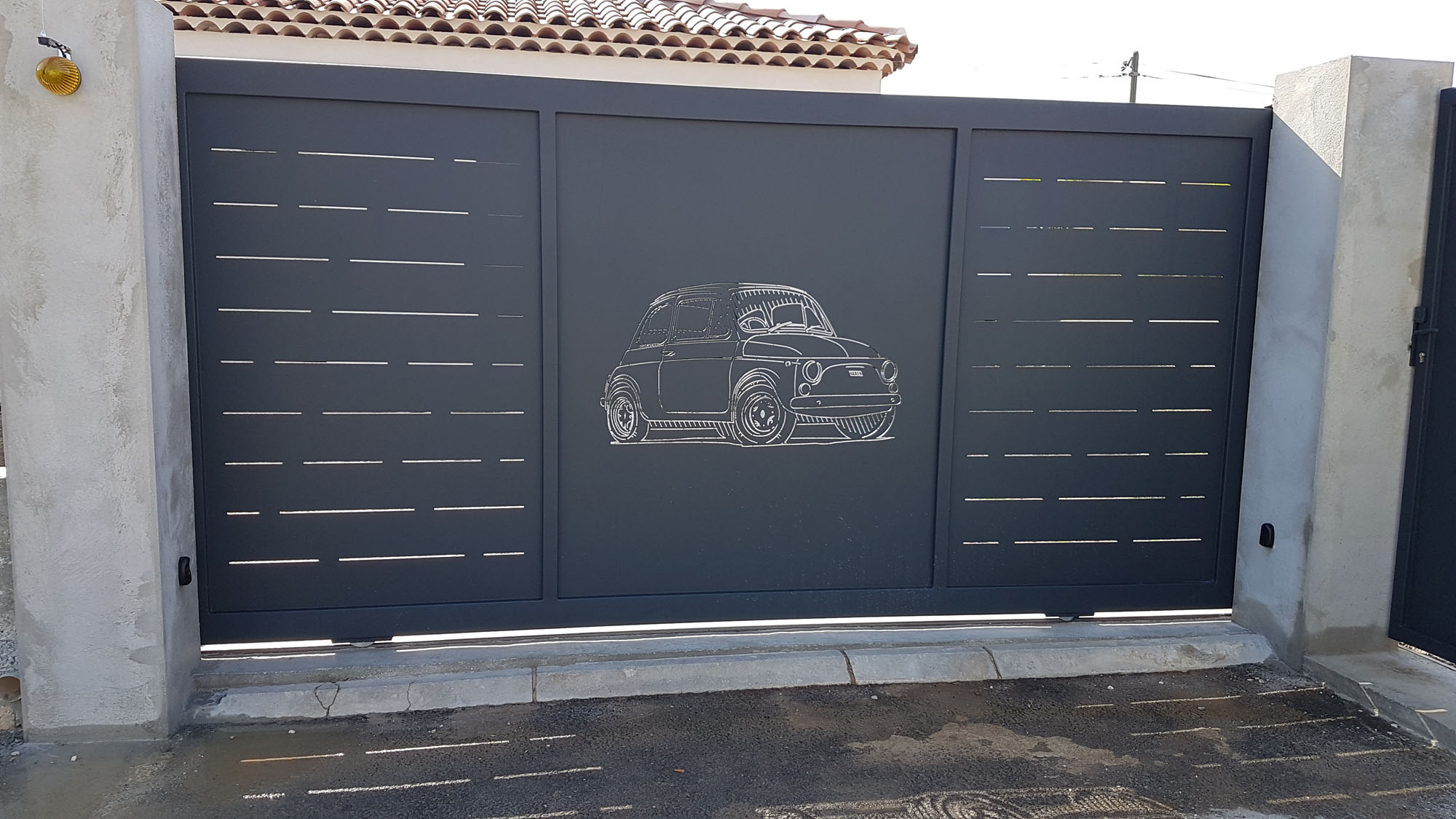 Portail et portillon découpe laser ” fiat 500 ” , toles épaisseur 3mm , tube 100×50 et 50×50 , peinture époxy polysing et finition RAL 7016 texturé