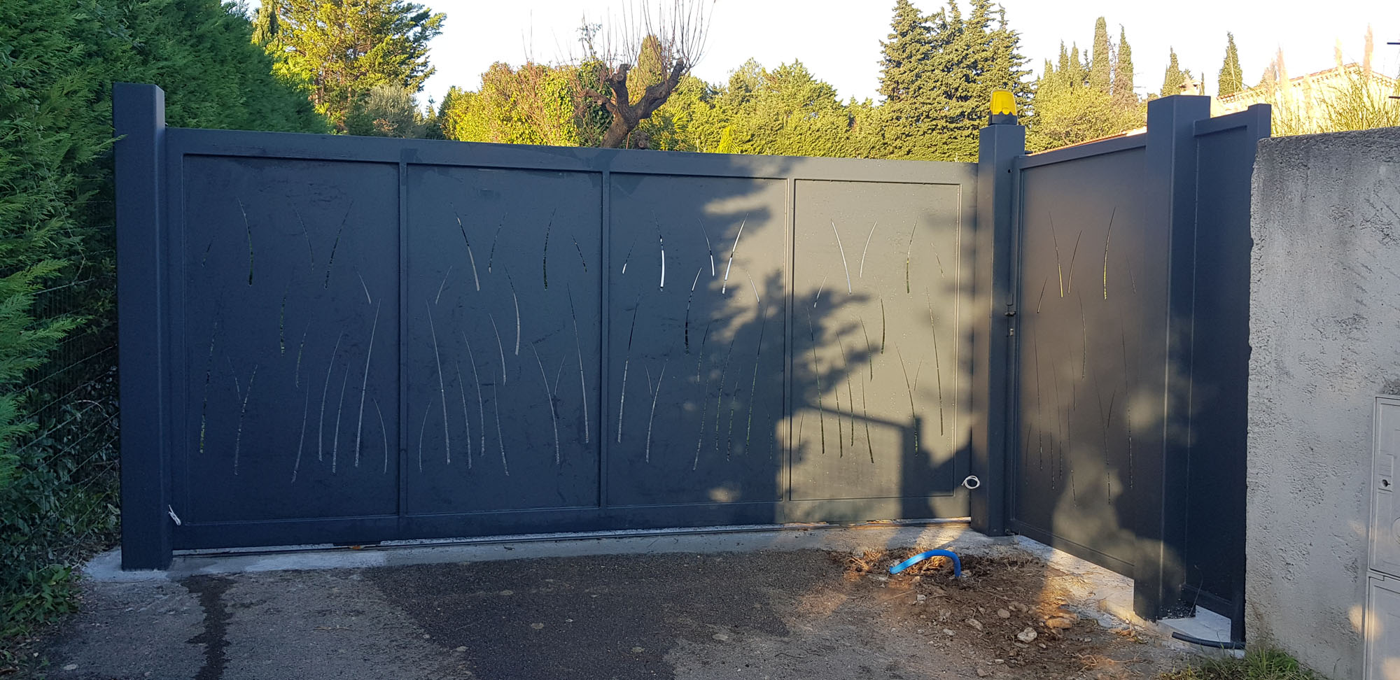 Portail coulissant avec son portillon et ses poteaux métal , peinture époxy