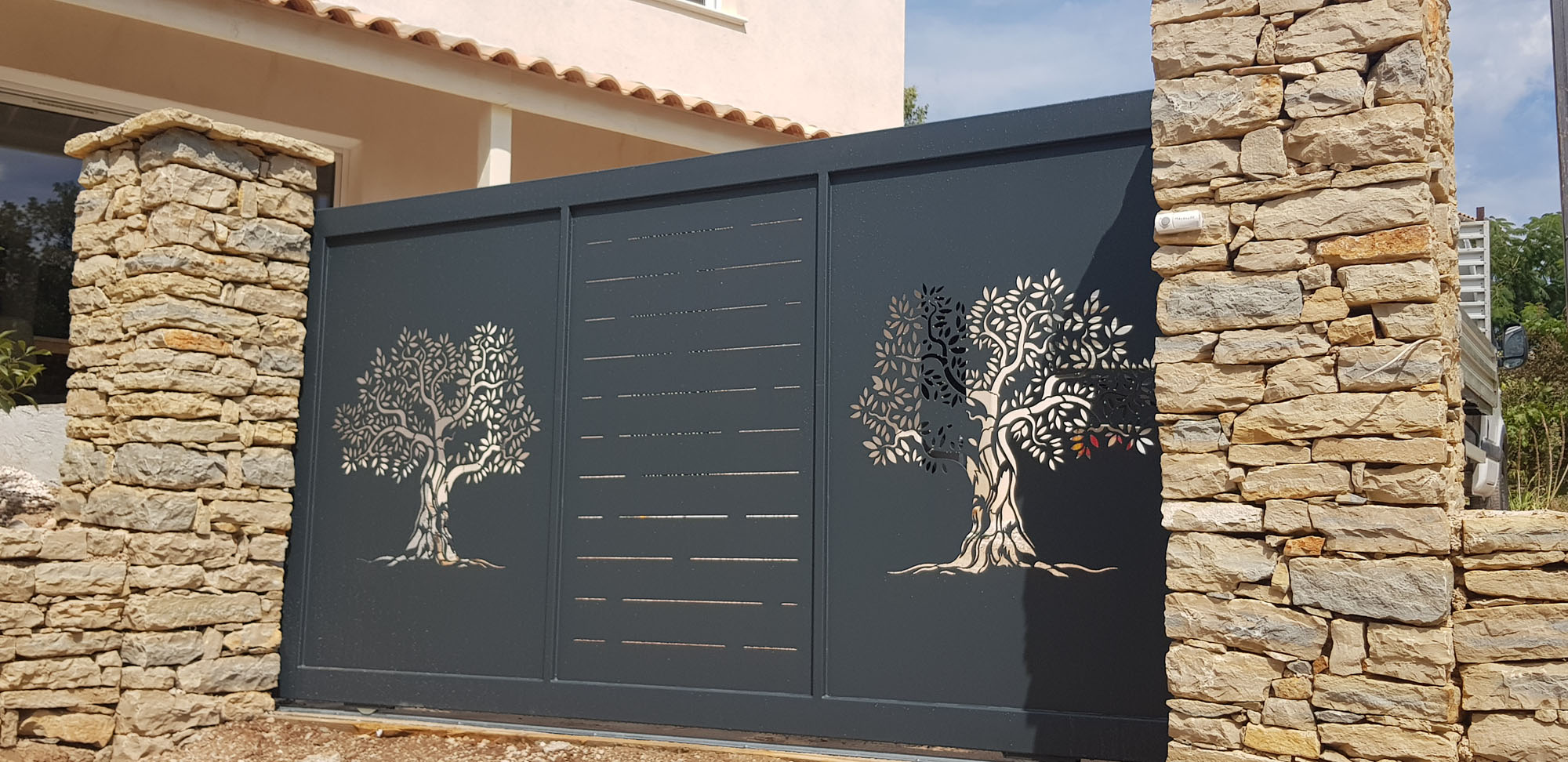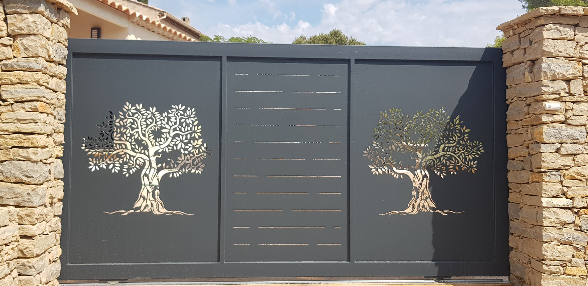 Portail coulissant sur mesure , toles découpées au laser et peinture thermolaquée époxy noir graphite