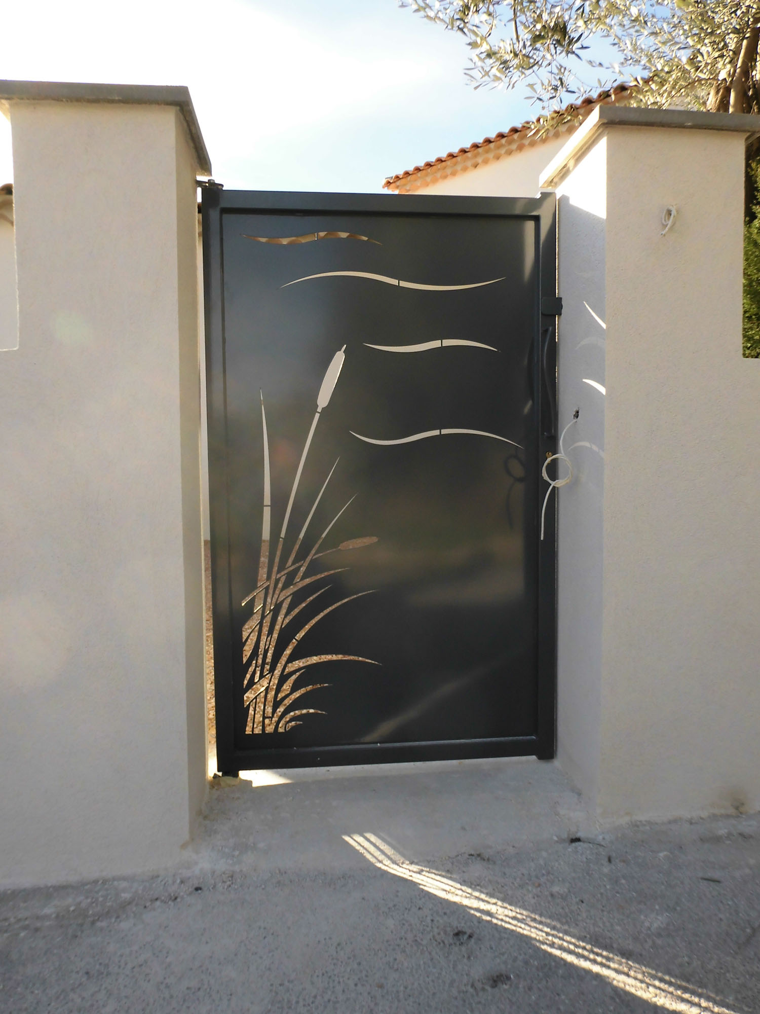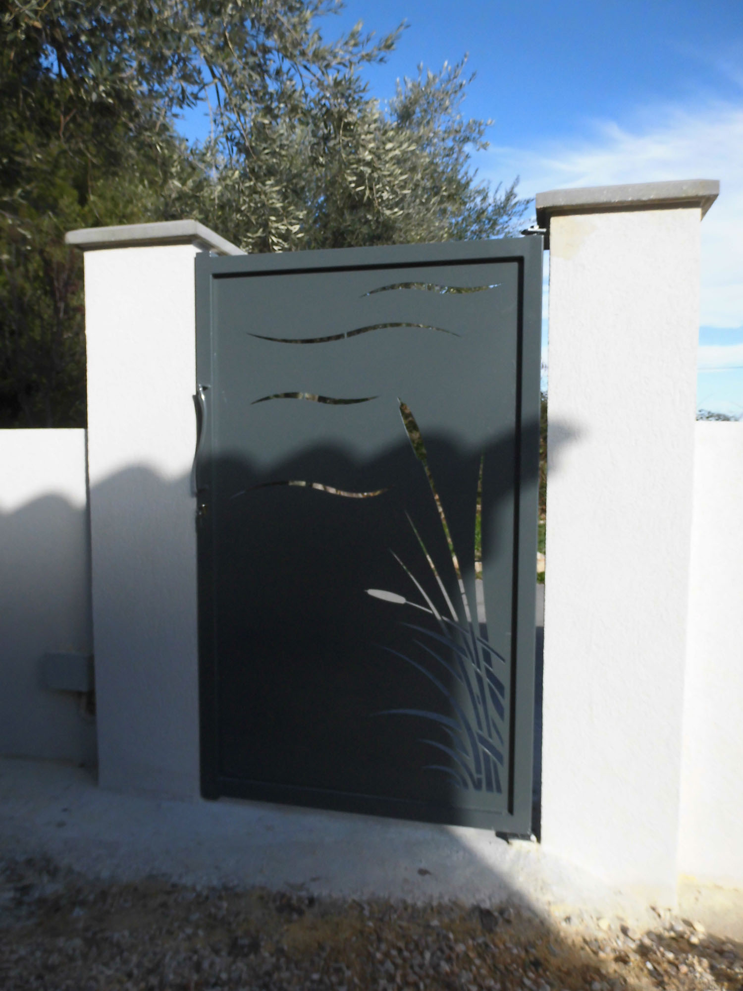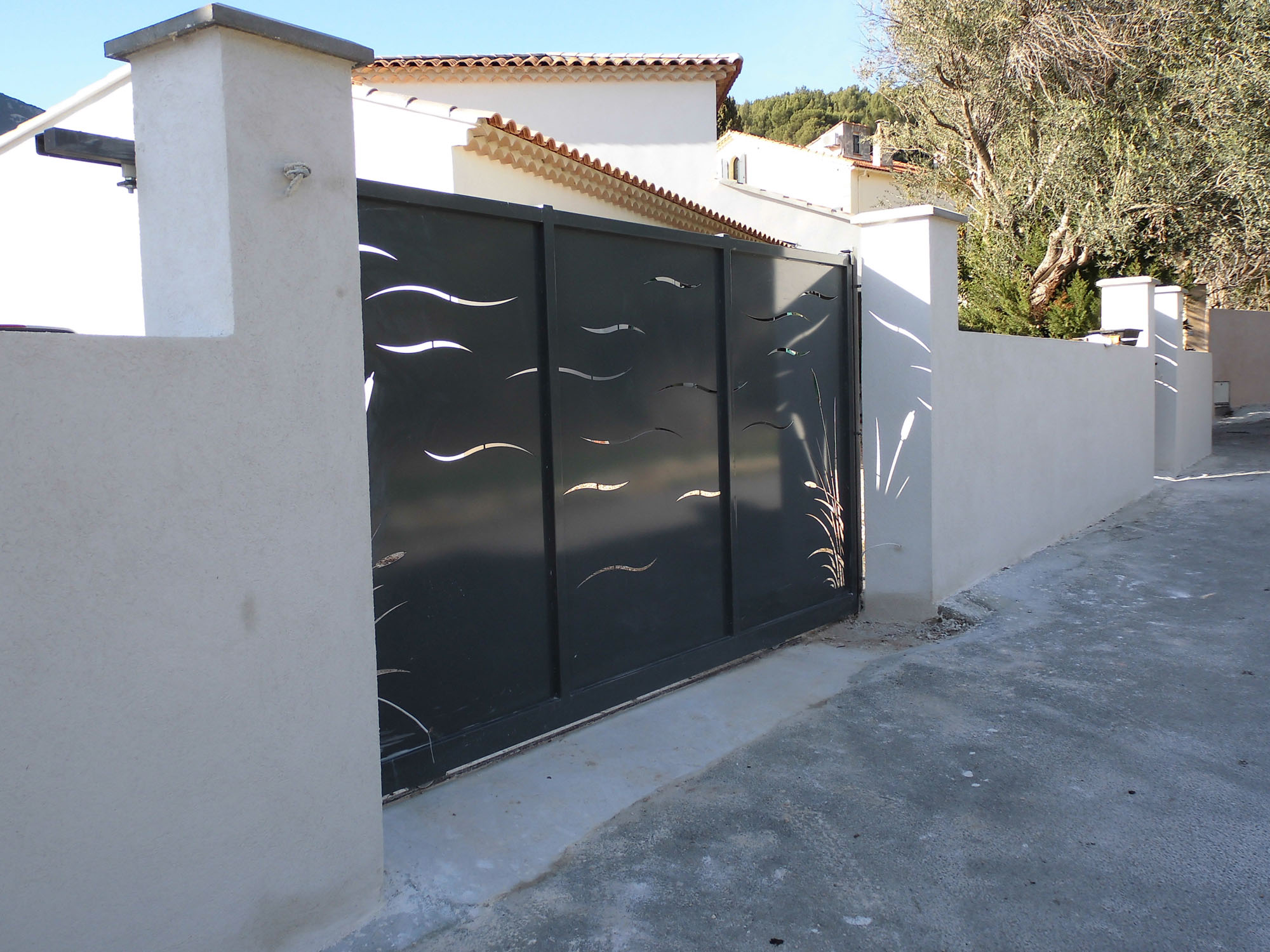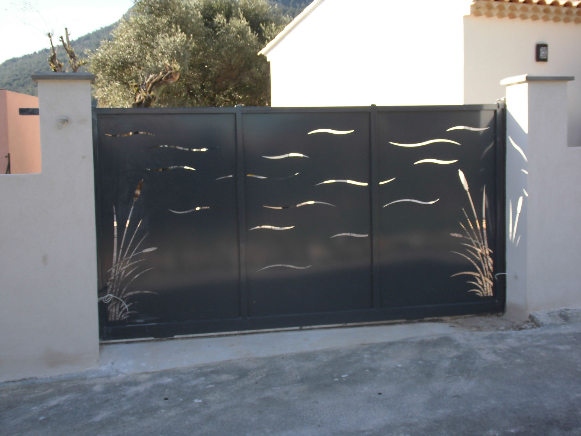 Portail coulissant sur mesure avec tôles découpées au laser.