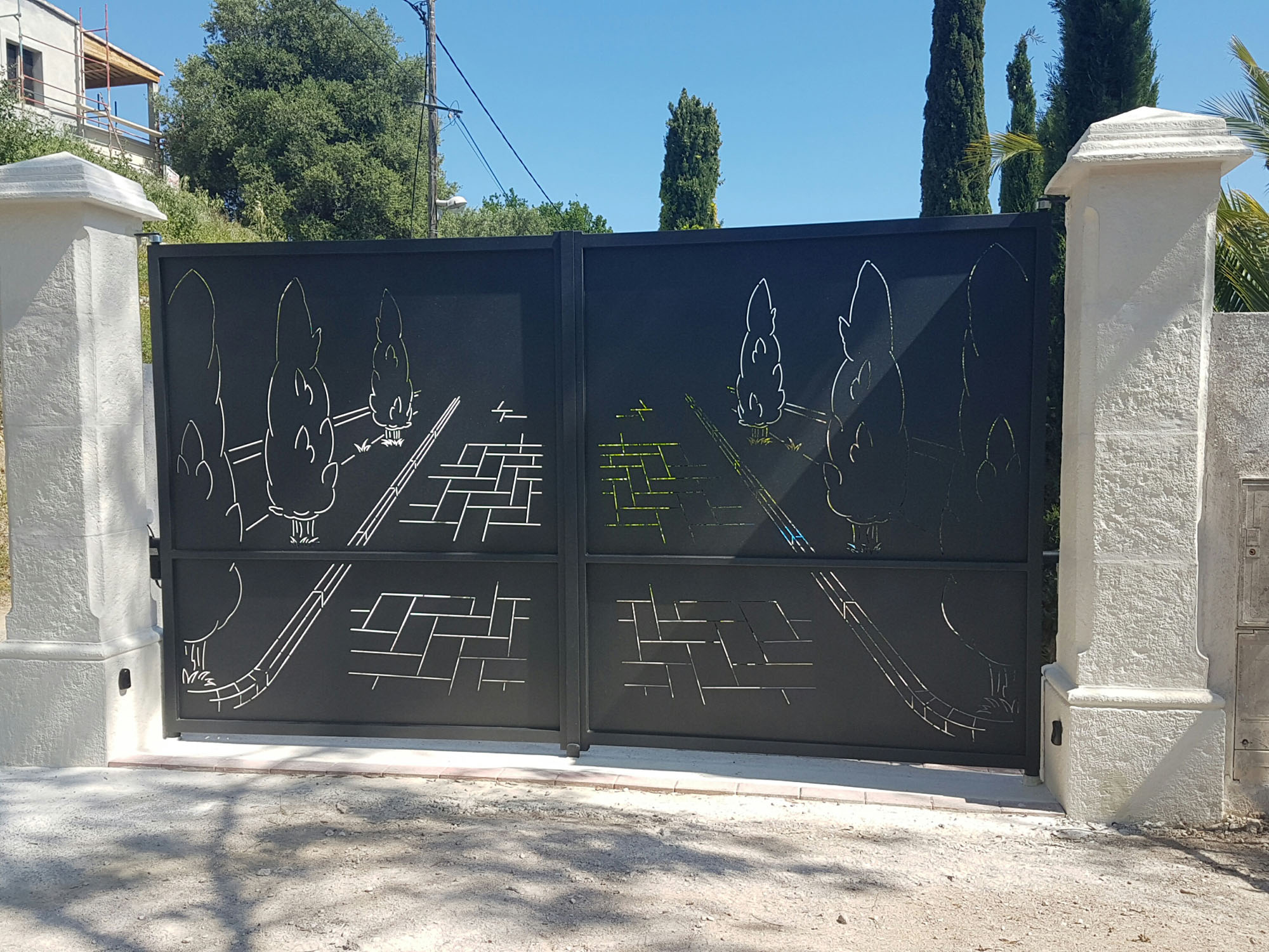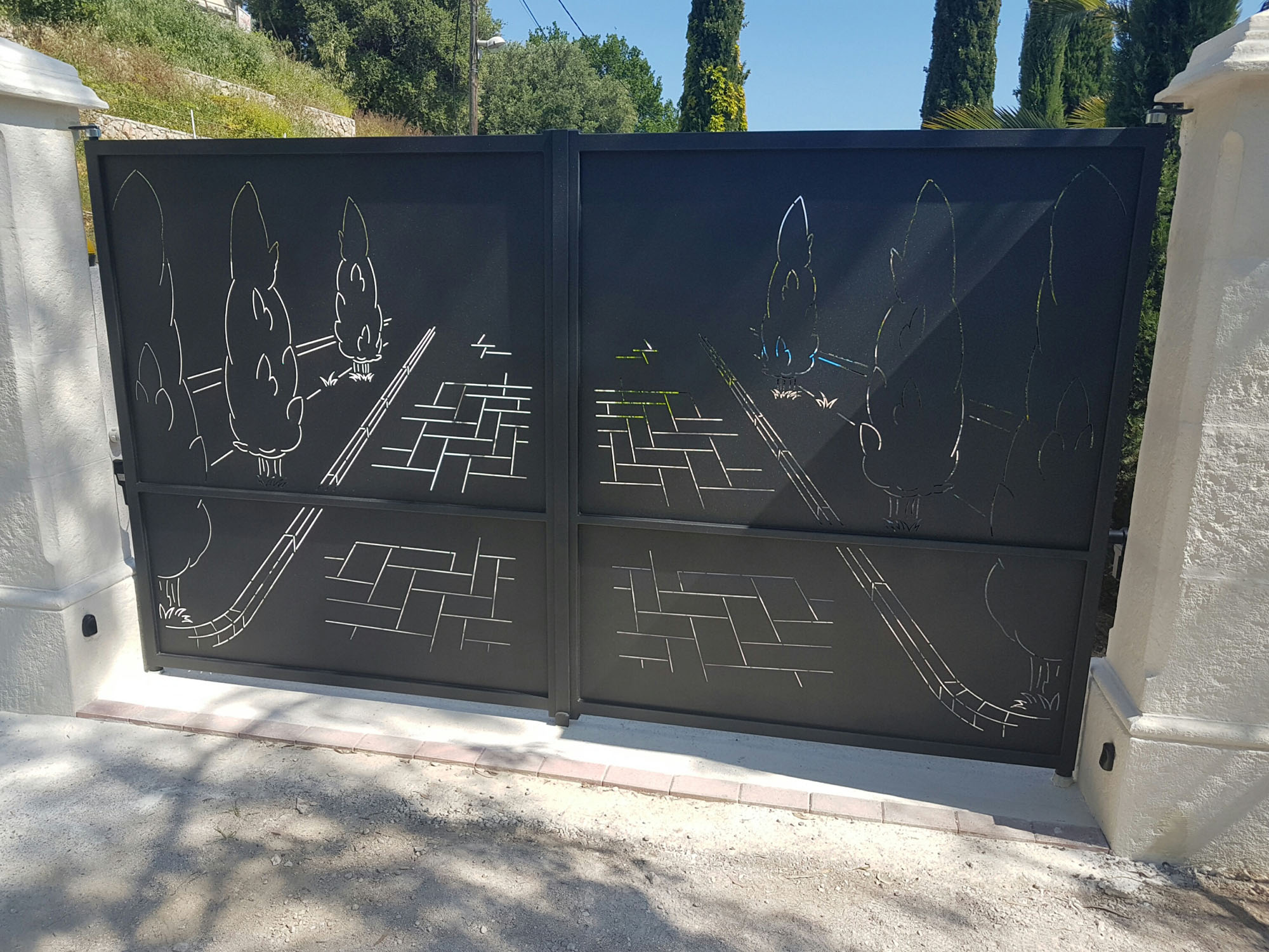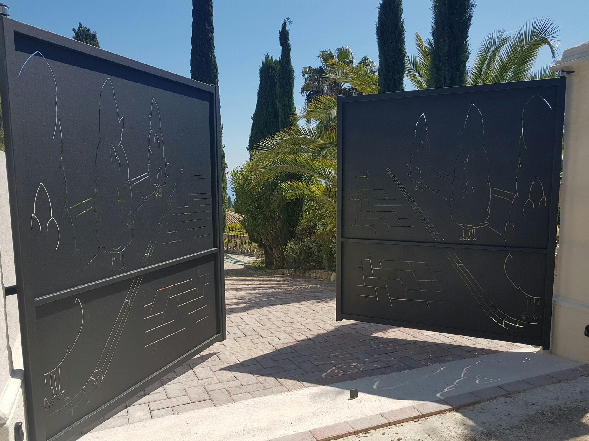 Portail deux vantaux avec découpe laser en perspective , reproduction de l entrée de la propriété , avec peinture époxy thermolaquée et automatisme