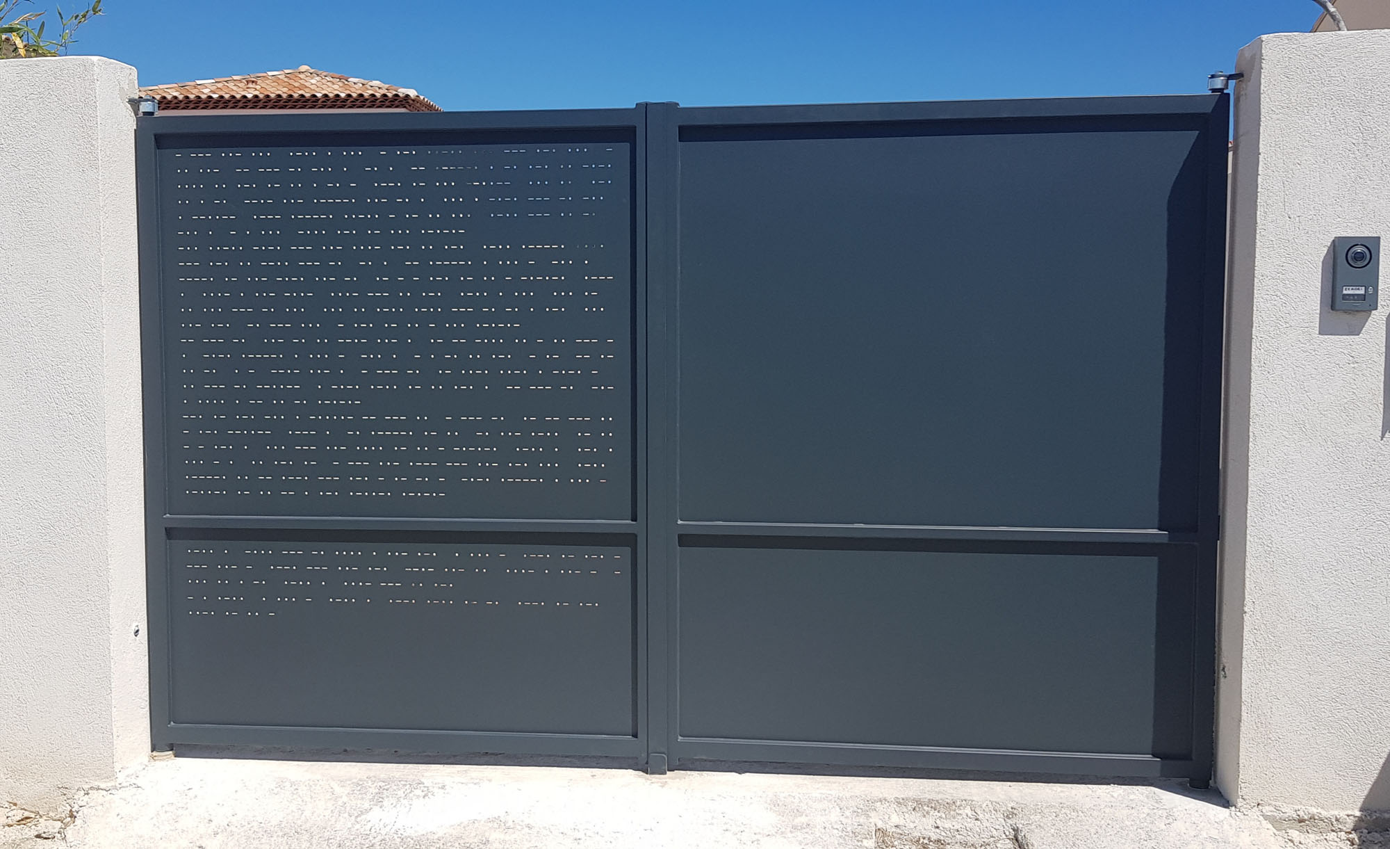 Portail deux vantaux dessin Morse en tôle de 3mm découpée au laser