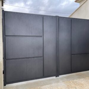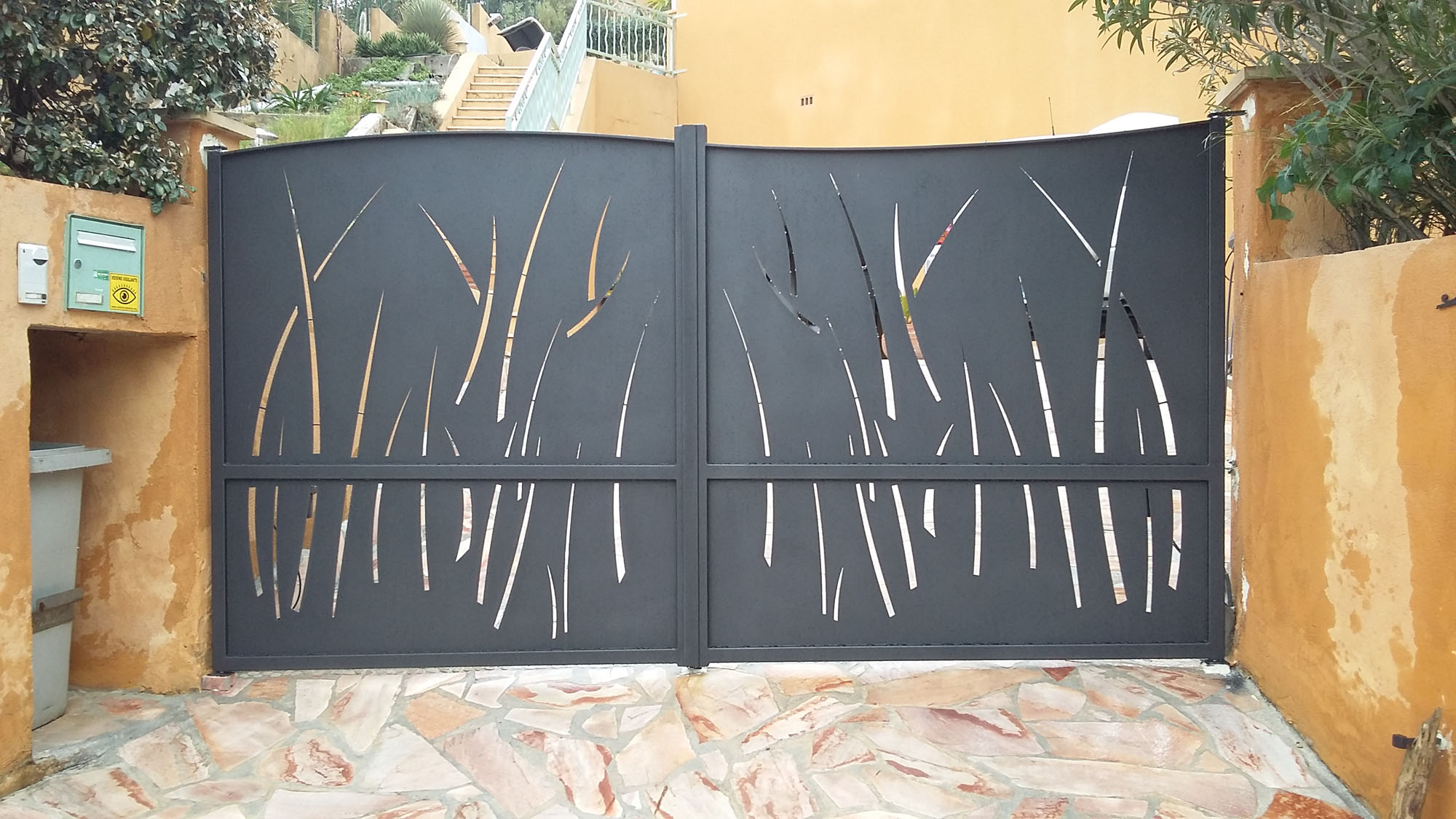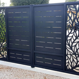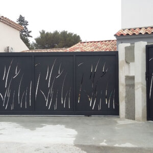 Portail deux vantaux sur mesure en tube de 50×50 , toles 3mm découpées au laser suivant dessin au choix du client et finition peinture époxy thermolaquée