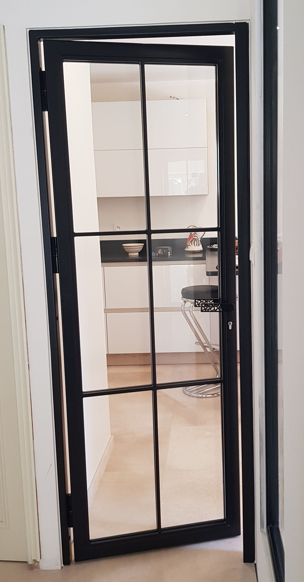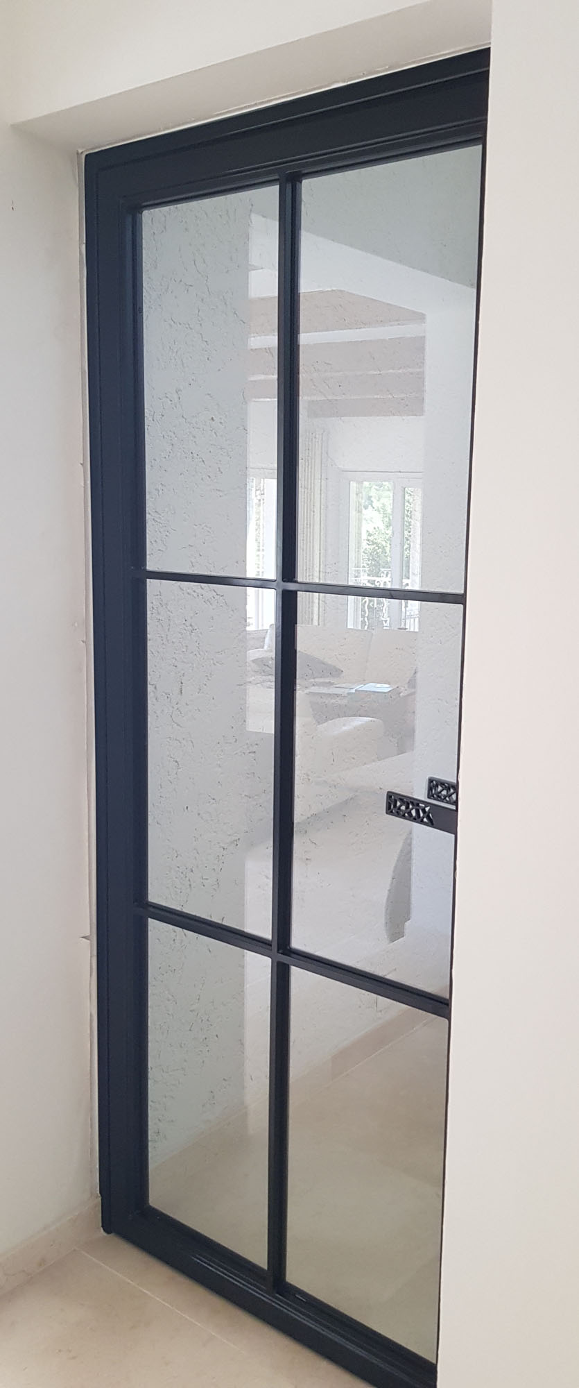 Porte métal d’intérieur sur mesure avec verre 44/2 sécurit , peinture époxy noir satin