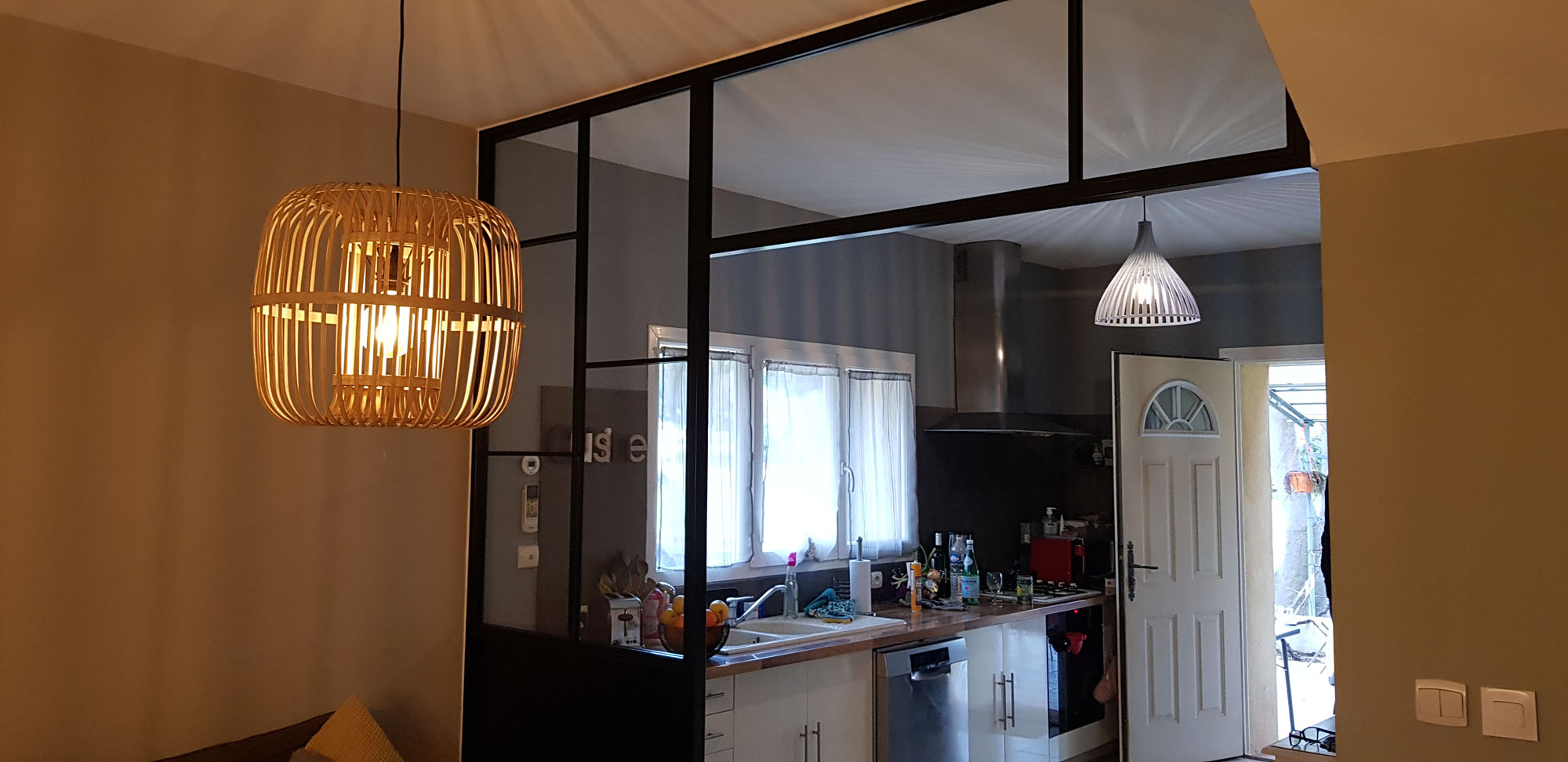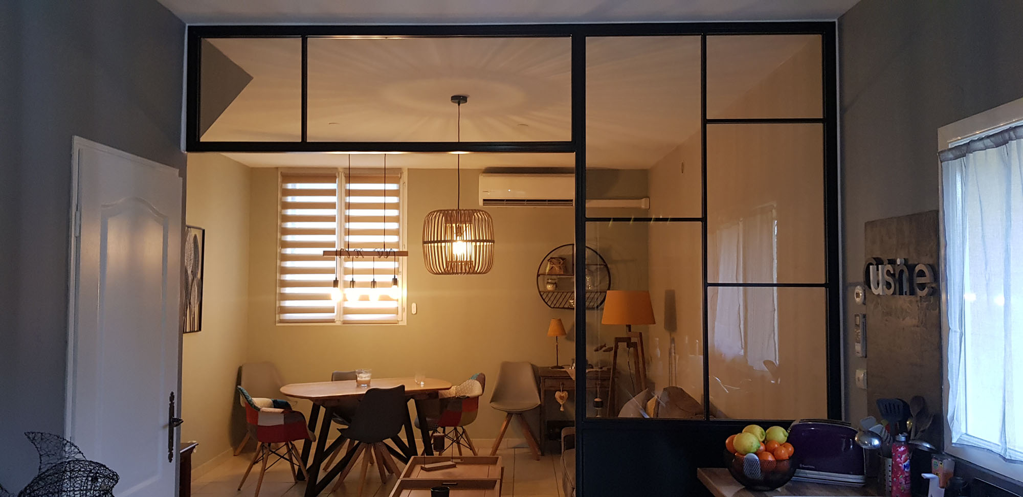 Verrière séparative entre cuisine et salon , verre sécurit et peinture époxy