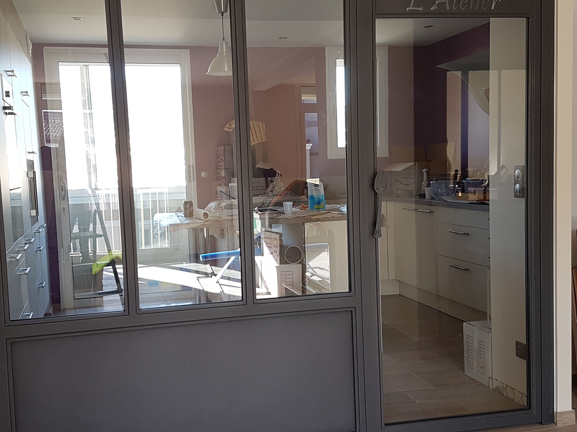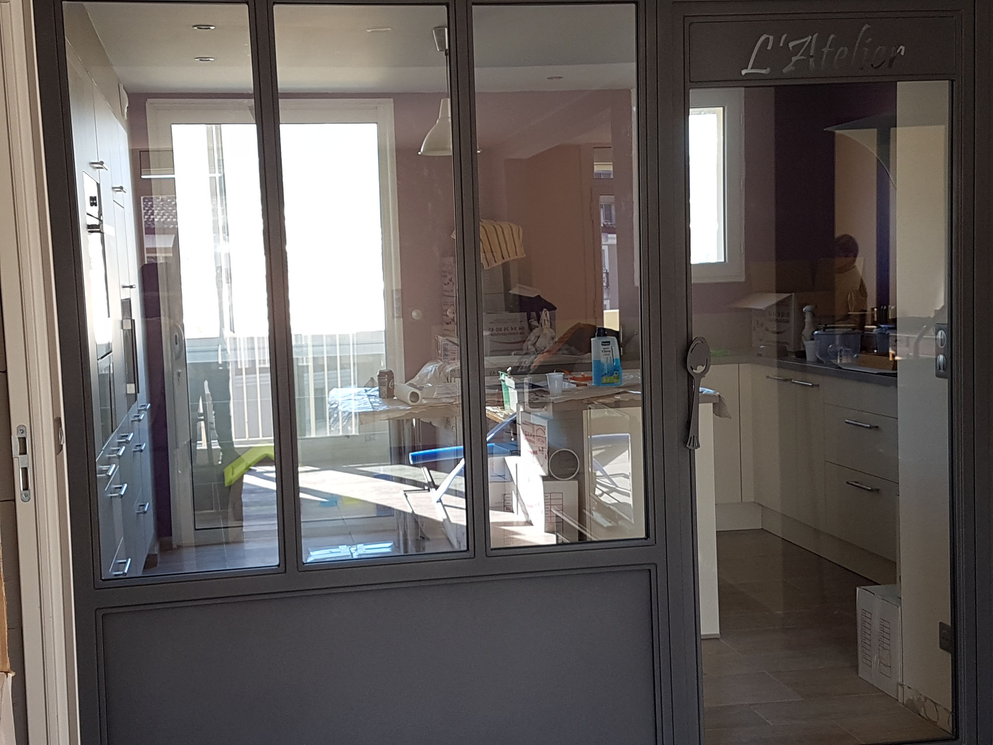 Verrière sur mesure de séparation cuisine – salle à manger, avec personnalisation, découpe laser et poignée en forme de cuillère, peinture époxy et verre 44/2