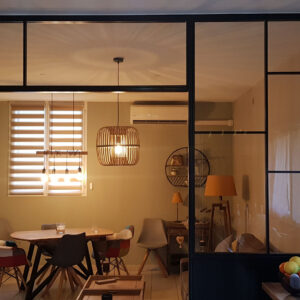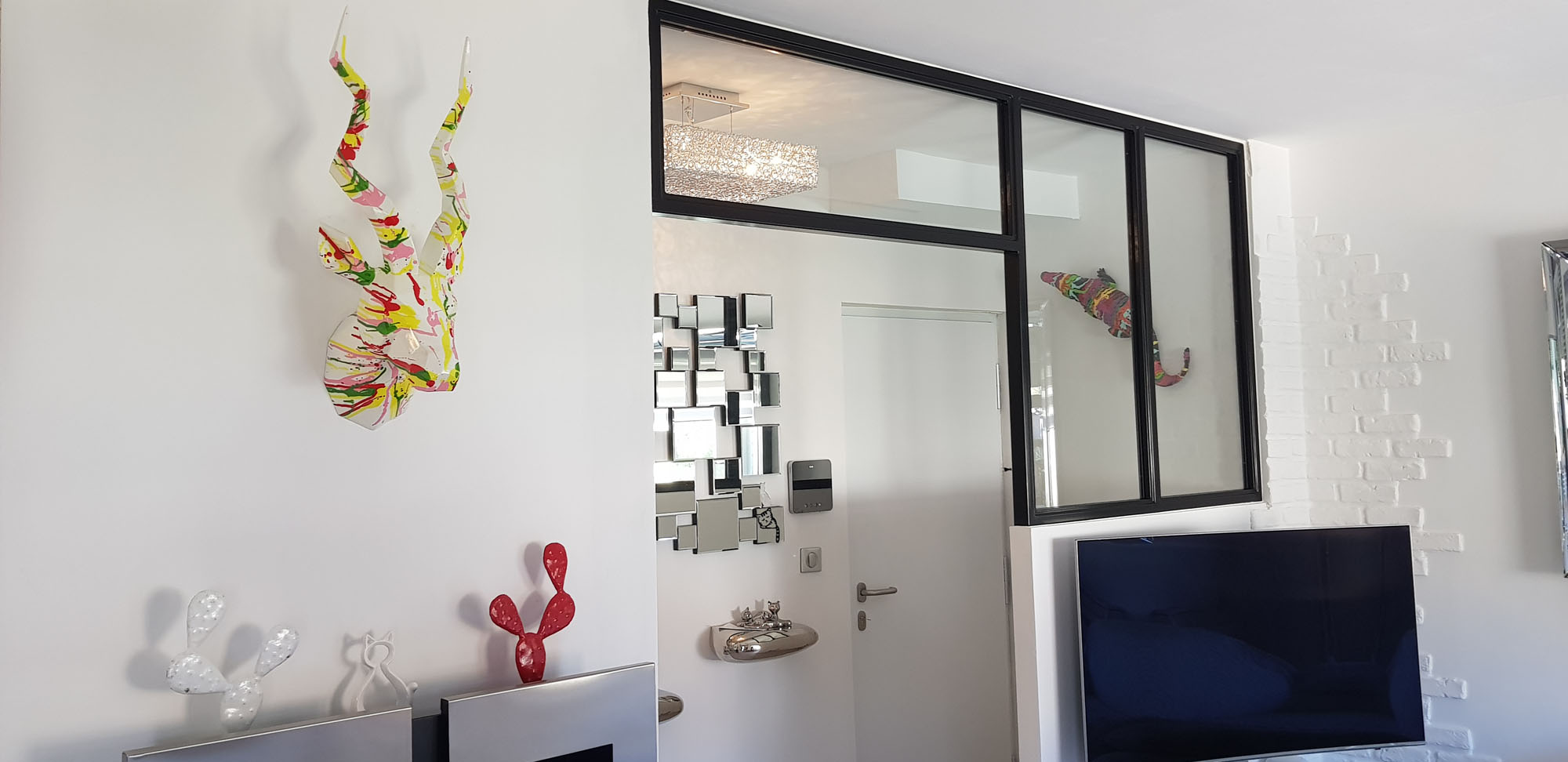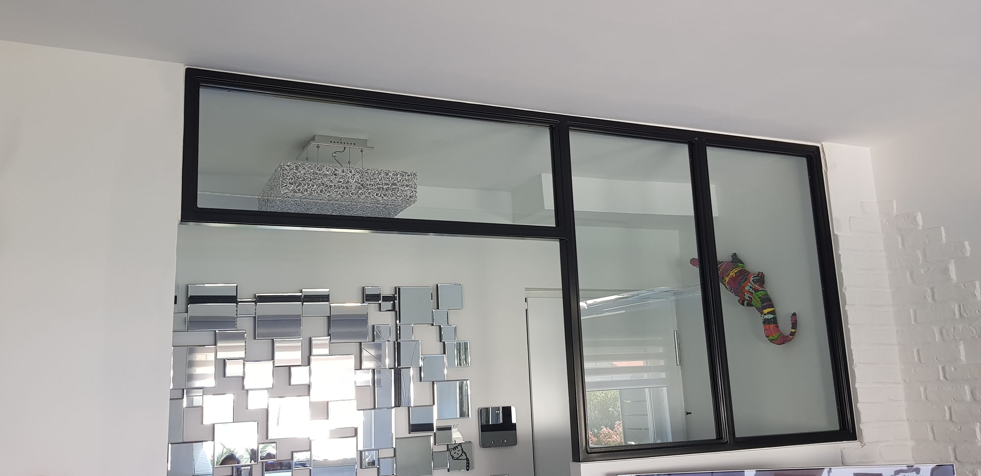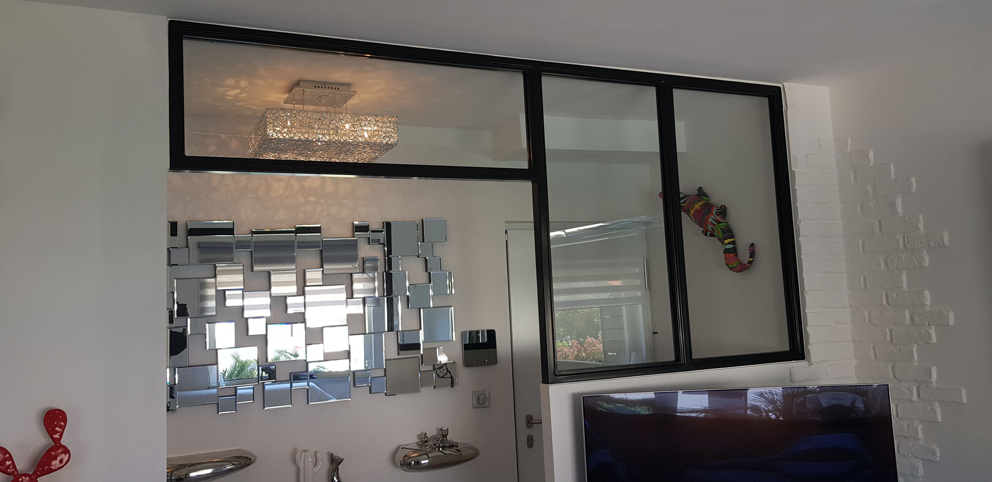 Verrière séparative entre hall d’entrée et salon , optimise la clarté de la pièce , peinture époxy noir satiné